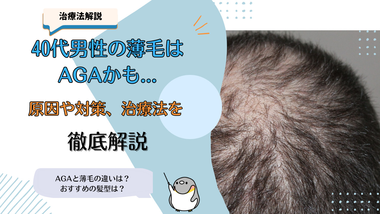 40代のAGAは、髪型などでは誤魔化せないくらいはっきりとした薄毛が特徴です。おでこがM字のように後退したり、頭頂部の肌が見えるような薄毛が多くなります。