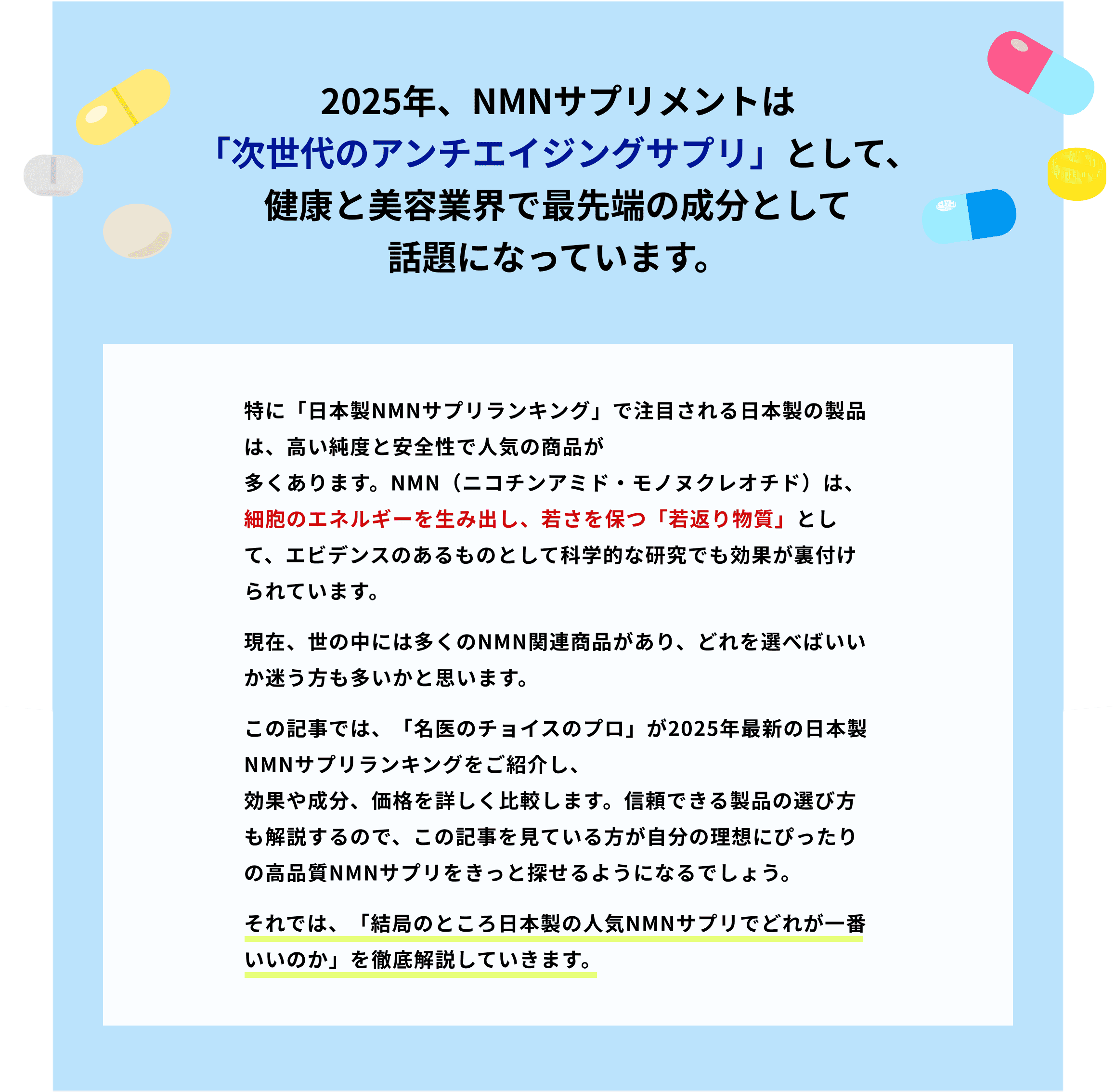 10 | NMN taisho(大正製薬) | ○ 99% | ○ | × | N/A | △ | △ 4.2円 | ○ 自社EC | ○ カプセル | 酵母発酵 | 日本 |